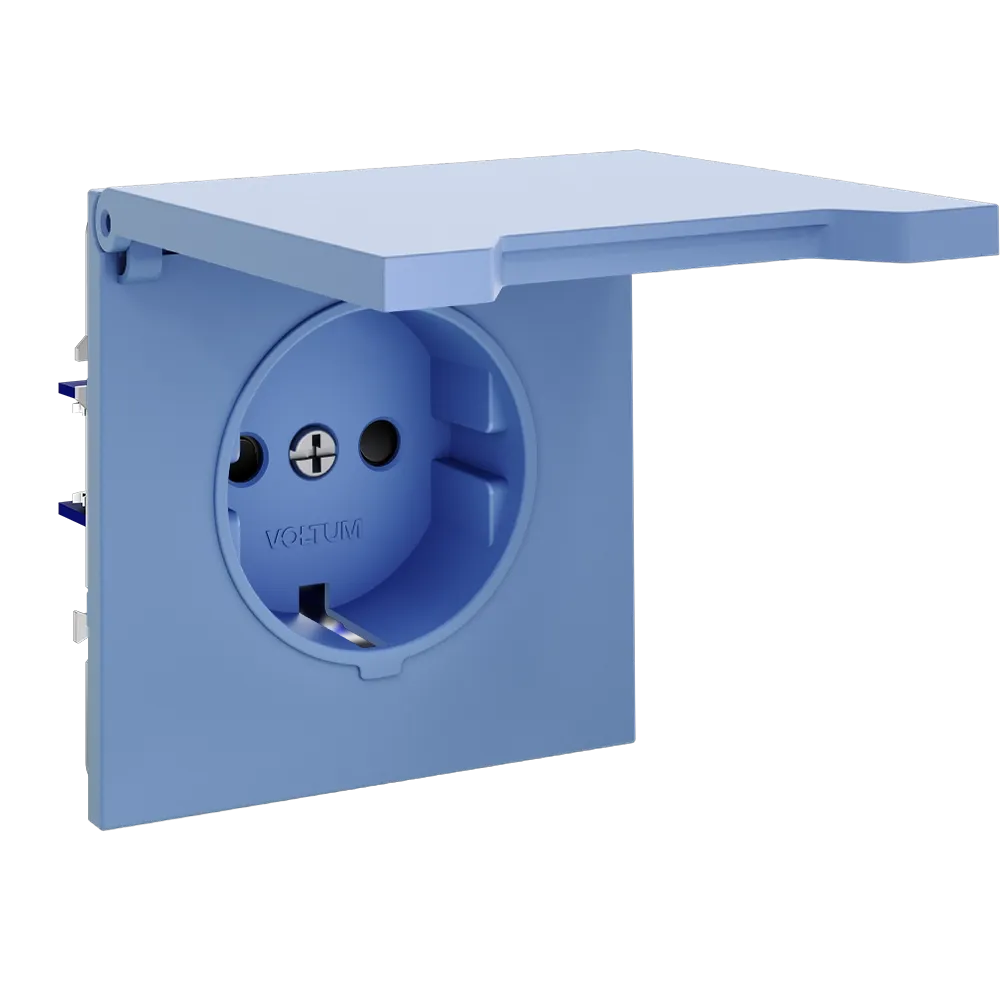 Благодаря степени защиты IP40 и наличию крышки, розетка надёжно защищена от проникновения твёрдых частиц и брызг воды, а встроенные шторки предотвращают доступ детей к контактам. Это делает изделие одним из самых безопасных в линейке Voltum.
